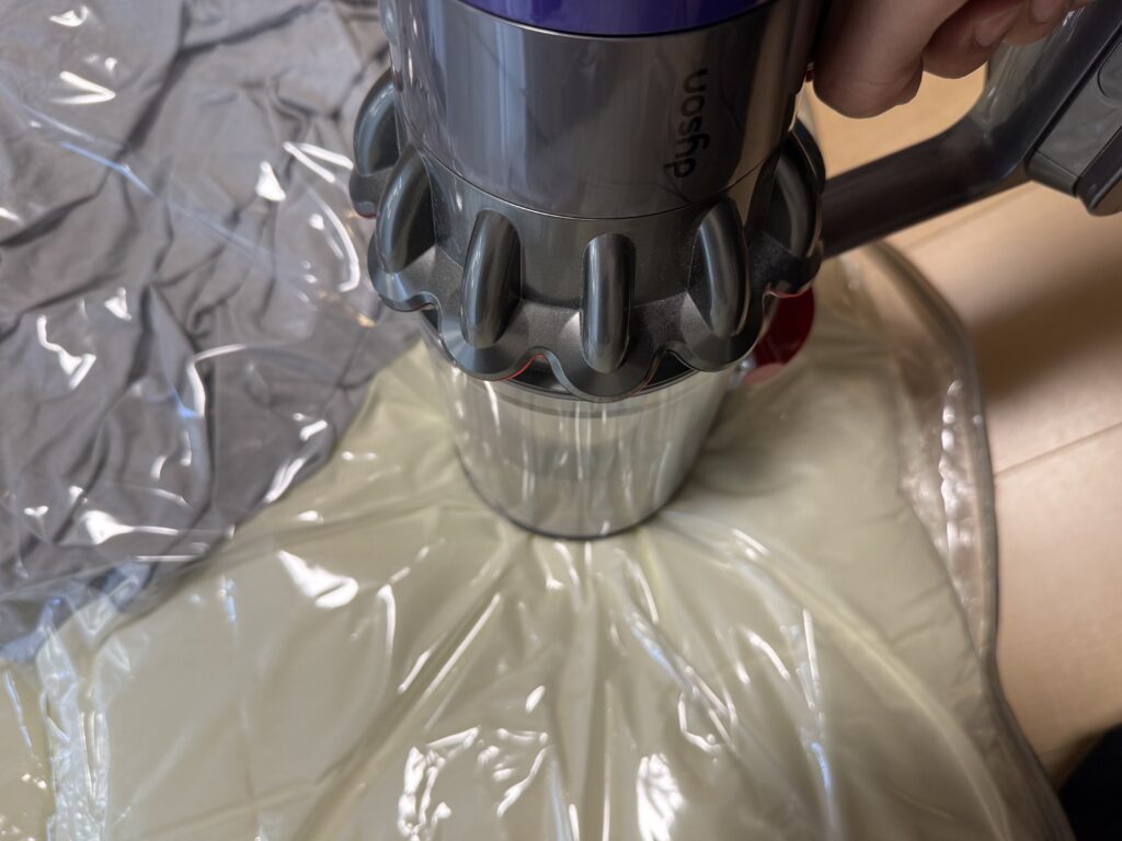 パッケージにはハッキリと「凸型ノズルでも使用出来ます!」の文字が。 実際にダイソンのノズルをバルブに当ててみると、隙間から空気が漏れることなく、グングンと布団が小さくなっていきます。