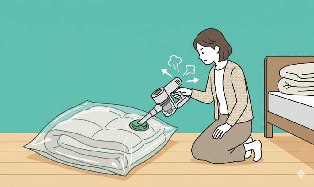 多くのユーザーが抱える「海外メーカーやコードレス掃除機(ダイソン等)のノズル形状だと、圧縮袋のバルブにフィットせず空気が抜けない」という問題。
